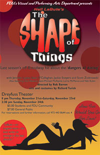 This poster was created in Illustrator to advertise a performance of Neil LaBute's The Shape of Things. The figure in the foreground represents the main female character as the temptress she appears to be in the play. The shapes in the background represent her influence on her male counterpart to change him into the person she desires.