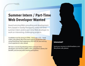 This piece was an ad created for Interactive Media Associates to recruit interns and part-time workers. It uses a bold image and colors to be eye-catching.