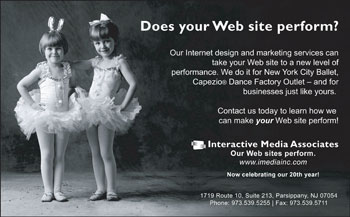 This ad was created for Interactive Media Associates to be run in a dance-related publication. With clients such as New York City Ballet and Capezio Dance Factory Outlet, IMA adopted the slogan "Our Web sites perform" and ran a series of ads targeted at the performing arts industry.